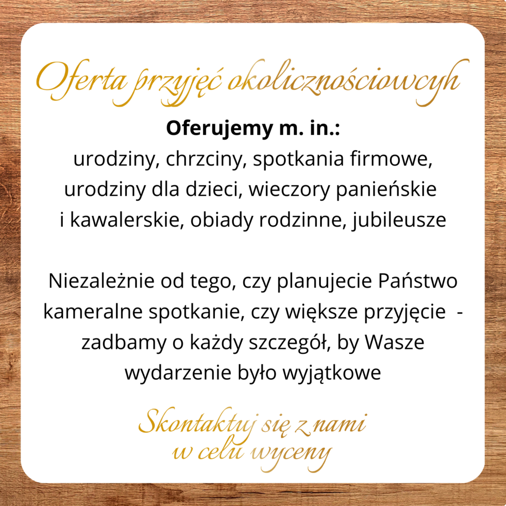 Z przyjemnością użyczymy Wam miejsce gwarantujące prywatność, z możliwością własnego przystrojenia przestrzeni. Menu oferujemy te, które obowiązuje w dany weekend, posiadamy szeroką gamę alkoholi i drinków. Tym, którzy wypoczywają, gwarantujemy, że nic nie zakłóci Waszej ciszy i spokoju.